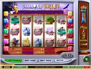 Diamond Valley is a 5 reel, 5 pay line progressive video slot game having a fixed betting coin value equal to $1. The Diamond Valley video slot game theme is about mining diamonds in a rocky valley. All the casino game symbols have a rock feel associated with it. They include the loved vulture hovering in the sky, handheld diamond, golden tooth smile, and the $ symbol.