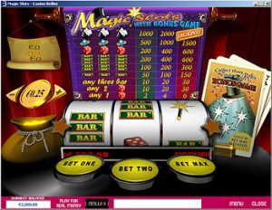 Any dice symbol will guarantee a payout, and three magic rings will secure the second largest payout for the player. Regarding the above mentioned bonus casino game, a player has to bet three coins per spin in order to qualify himself to collect magic wands, and earning three such magic wands lets him enter the bonus game. In the bonus game, he has to pick one of the 4 magician’s hat, and depending on that, he’ll be awarded a prize.