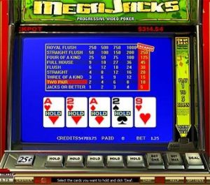 Megajacks video poker allows you to draw once, at which point your final hand is evaluated and you are paid according to the Paytable. The main difference between Megajacks video poker and “Jacks or Better”, is the fact that part of the bet goes into a progressive jackpot, which you can then win with a royal flush hand on five coins.