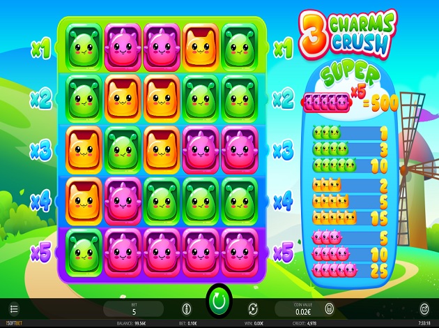 3 Charms Crush Online Video Slot is a 5 reel with 5 paylines video slot powered by iSoftbet. The slot is like a candy crush game with a Korean Aegyo feeling to it. The reels have just 3 colored symbols. If you land wins on specific paylines your wins maybe boosted up to 5x. There are multipliers, cash prizes for matching symbols on the specific paylines and also a jackpot worth 500 coins. The slot can be played from mobile devices such as IPhones, IPads, Android phones, tablets and many more.