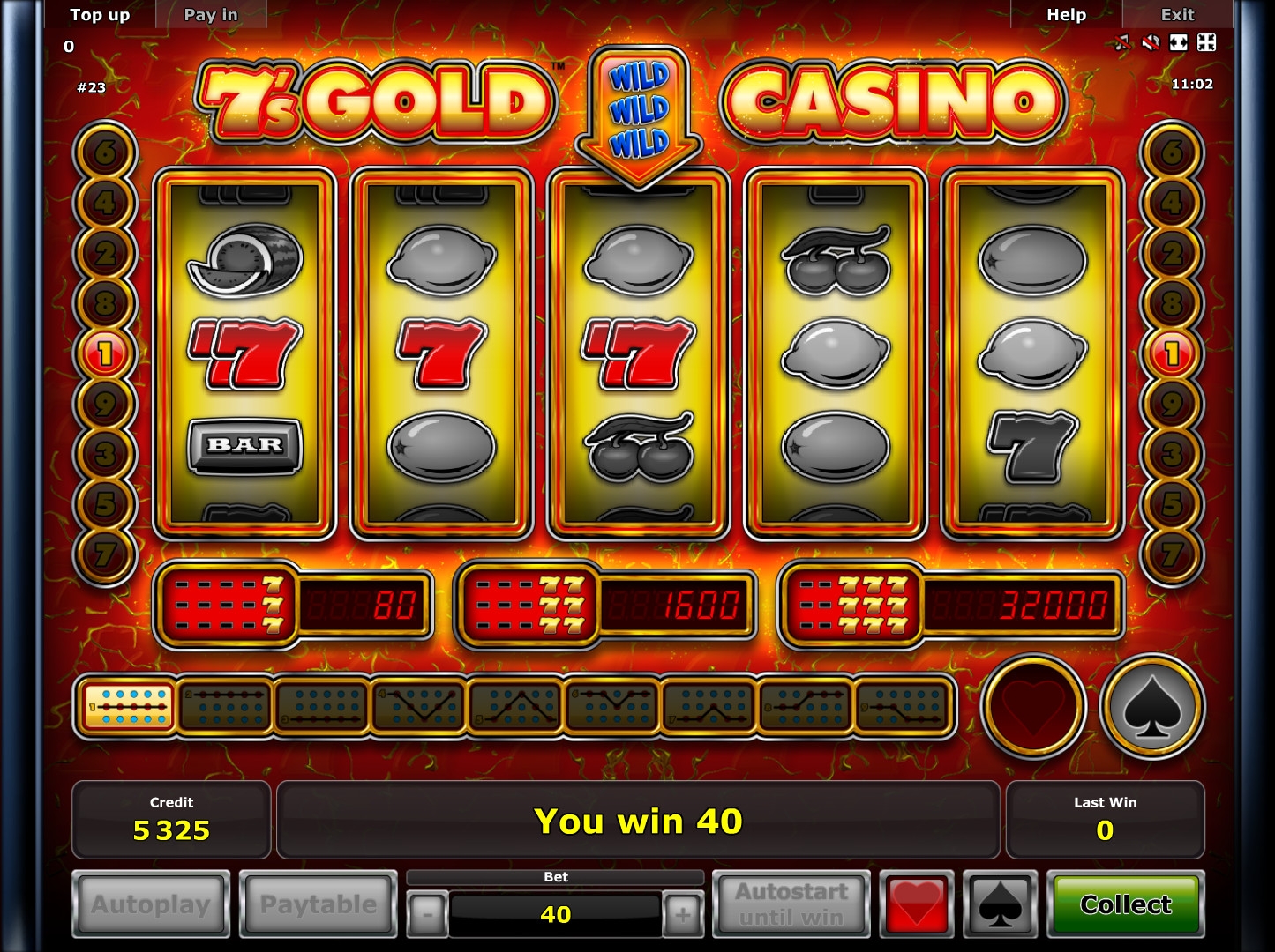 7’s Gold Casino Online Video Slot is a 6 reel with 9 paylines video slot powered by Novomatic. The slot has retro look and classic design. Do not get irritated with the 2D graphics and the animations, just focus on landing the high symbols on the reels. You will find fruit symbols such as cherries, watermelons, grapes and lemons. You will also find retro symbols such as bars and lucky 7s. There is also a wild symbols that substitutes for all the other symbols.