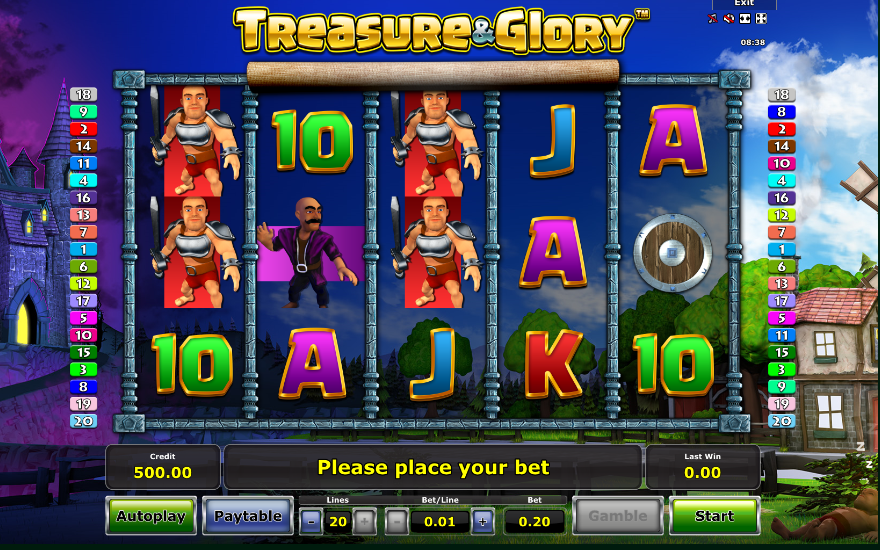 Treasure & Glory Online Video Slot is a 5 reel with 20 paylines video slot powered by Novomatic. The slot has a medieval theme with giant symbols displaying all the symbols available on the slot including the wilds and the scatters. There is free spins feature with a bonus feature in it that can win you up to 500x your stake in just one free spins round.