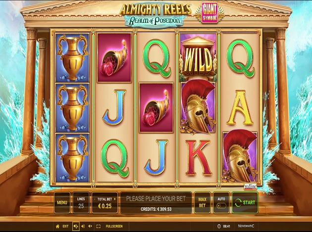 Almighty Reels- Real of Poseidon Online Video Slot is a 5 reel with 25 paylines video slot powered by Novomatic. The slot has a Greek Mythology featuring the lost city of Atlantis. It is set within a temple in the old ruins of Atlantis. The slot comes with free spins and also the giant symbols. The giant symbols can appear as stacked to increase your winning potential.