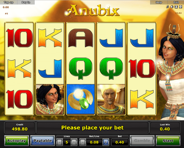 Anubix Online Video Slot is a 5 reel with 5 paylines video slot powered by Novomatic. The slot takes you to the ancient Egypt mythology in the pyramids and the ruins to try and find some of the treasures hidden there. Anubis was the god of the dead and mummification. This was the error of Cleopatra. On the reels you will find ancient symbols from the Egyptian mythology. The symbols pay when you find 2 or more symbols on the reels from left to right. You will benefit from scatters, wilds and free spins feature
