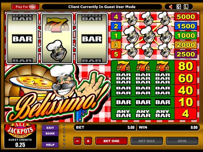 Belissimo Online Video Slot is a classic slot which has three-reel with three rows and five pay-lines, designed by Microgaming. The slot has a world-famous Italian cuisine theme. The chef of the slot cooks delicious prizes for you in the game. There are no special features in the slot. The background is a red and white checkered tablecloth found in Italian restaurants. Below the reels of the slot, the main chef of the game with a big mustache is holding a delicious pizza for you.