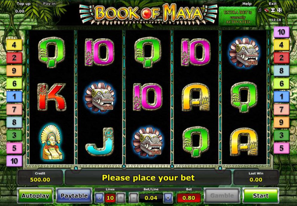 Book Of Maya Online Video Slot is a 5 reel with 10 paylines video slot powered by Novomatic. This slot takes you on a journey to uncover the Aztec treasures. On the reels you will see the pillars of the ancient Aztec temple with green moss plants to initiate that it has been there for ages. From the top of the temple there are vines and tress sprouting out. The paylines can be adjusted from the controls in the three boxes mid-section of the control panel. There are scatters and wilds, free spins feature and a gamble game option.
