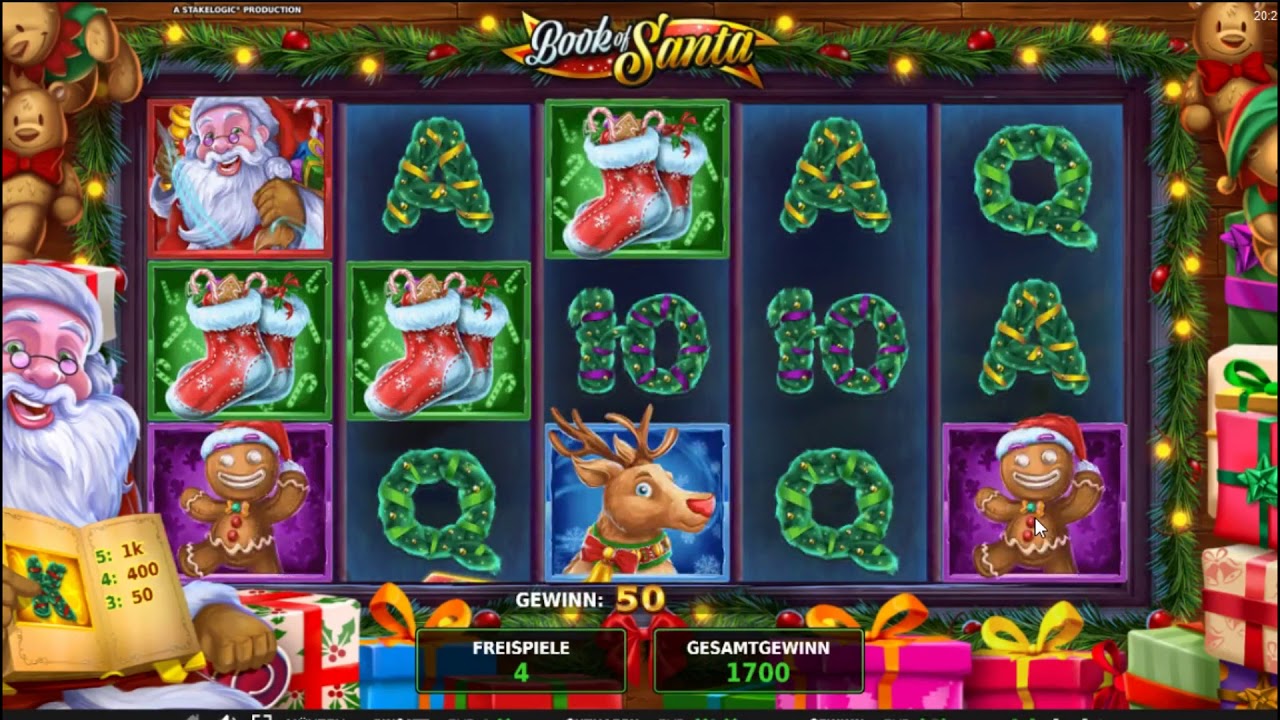 The Santa’s book doubled as a scatter and as a wild. It can substitute for all the other symbols and also trigger the free spins feature.