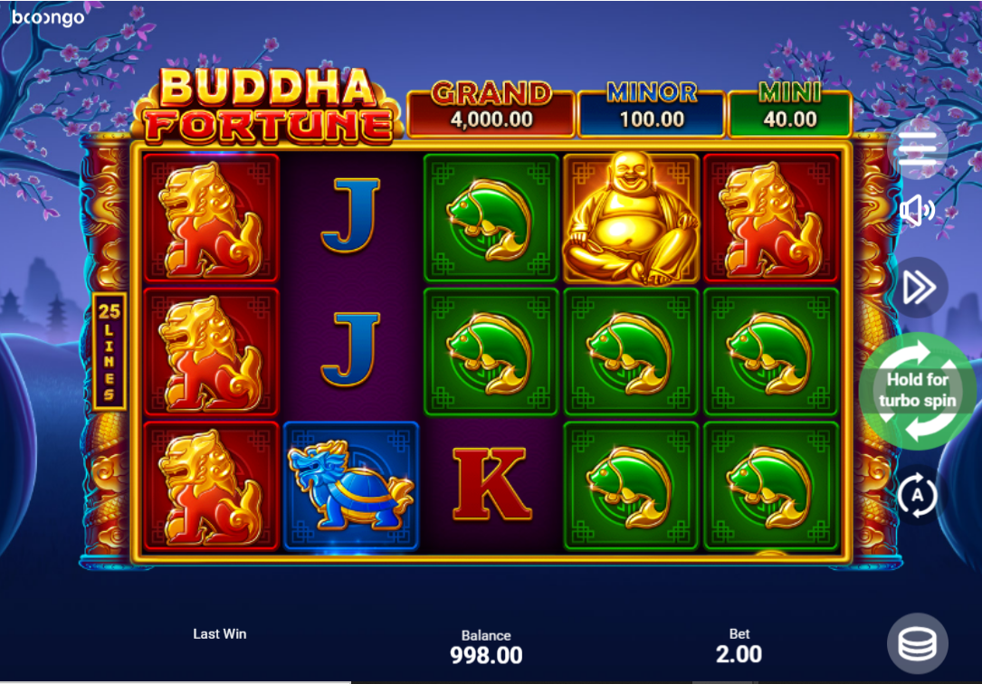 Buddha Fortune: Hold and Win Online Video Slot is a 5 reel with 25 paylines video slot powered Booongo Games. The game has a fairytale theme featuring the Buddhist religion and its specific elements. The setting is on a backdrop of ancient peaceful religious zones such as at the foot of the hills with pink cherry blossom trees flagging the reels. The game spins on a 5×3 grid with up to 25 active paylines. You can win a payout by matching at least 3 symbols from the leftmost reel. There are special symbols such as scatters, wilds, and jackpot symbols. The game can be played on mobile devices.