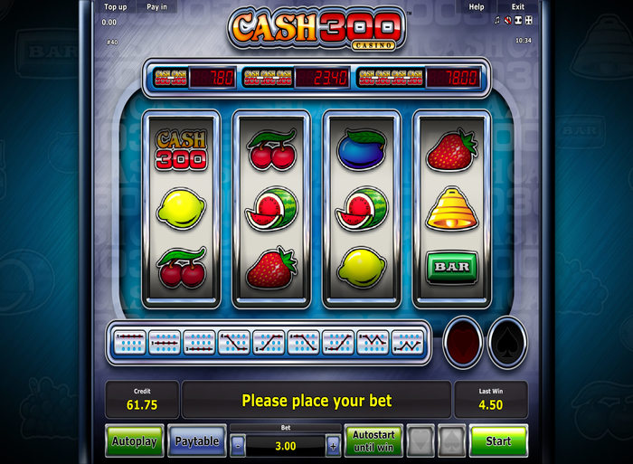Cash 300 Casino Online Video Slot is a 4 reel with 9 paylines video slot powered by Novomatic. Fruit symbol themed slots still have high influence in Novomatic slots. Novomatic tops the list as the slot maker that has many fruit and retro symbols themed slots. And still they are not backing down. You can now play the 4 reeled Cash 300 Casino slot from you devices supported by Mac, Linux or Windows operating systems. On the reels you will find the usual berries, plums and other fruit symbols. The main aim is to match 3 or more identical symbols on the reels to win symbol payouts. There is also the gamble game option and the auto play that can be controlled by the control buttons. The auto play allows you to automatically spin the reels number of times.