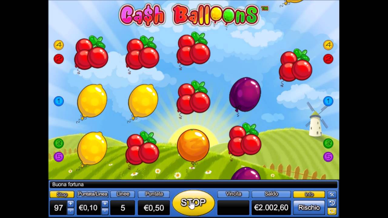 Cash Balloons Online Video Slot is a 5 reel with 5 paylines video slot powered by Novomatic. The slot adds to the long line of Novomatic fruit themed slots. The fruit slots and the retro slots are believed by most players to be easy to play but lack most of the enticing features. But this slot has a twist, despite its theme; it has thematic features that make it compete with other slots of its kind. The game is designed with great graphics and a nicely planned game play. The slot is set in some imaginary dimension and the reels are held in a background with green hills and you can even spot the sun lighting the reels, windmills and colorful flowers. It can be played from all devices supported by the Mac, Linux or Windows operating systems.