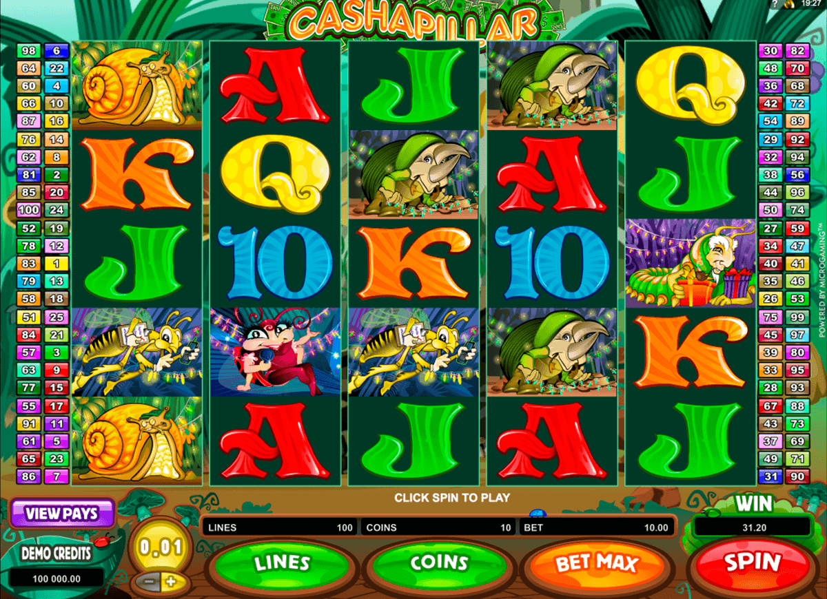 Cashapillar Online Video Slot is a 5 reel with 100 paylines video slot powered by Microgaming and Quickfire. The slot features green woodland drawings of children playing symbols. The slot is set in green woodland with nicely drawn caterpillars, grasshoppers and alsothe colored playing cards. It is designed with great graphics quality and also cute animations making the game play easy and enjoyable. There are wilds, scatters, free spins feature and also the gamble game. The slot can be played from devices supported by Mac, Linux or Windows operating systems.