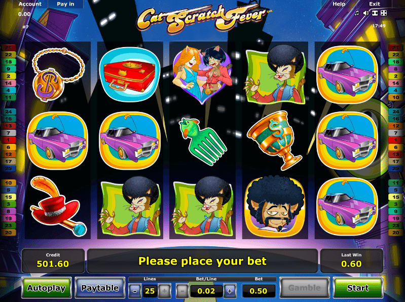 Cat Scratch Fever Online Video Slot is a 5 reel with 25 paylines video slot powered by Novomatic. The slot highlights the story of an infection one gets when you get scratched by a cat and then twisted with a night out fever, so when you wake up in the morning, the night fever and still the scratch fever persists. On the reels you will find dancing cats and pink caddies. You will benefit from free spins, a gamble game and a bonus feature. The slot can be played from all devices supported by Mac, Linux and also Windows operating system.