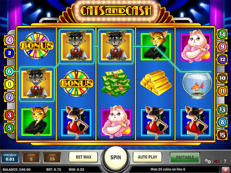 Cats and Cash Online Video Slot is a nice slot to play. The slot has a simple game play with simple but nice features. It offers nice graphics and also stimulating visuals. The slot has a medium to high variance with the maximum wins per spin standing at 12300x your stake. All these can be realized in the wheel of fortune bonus or the pick a gift bonus.