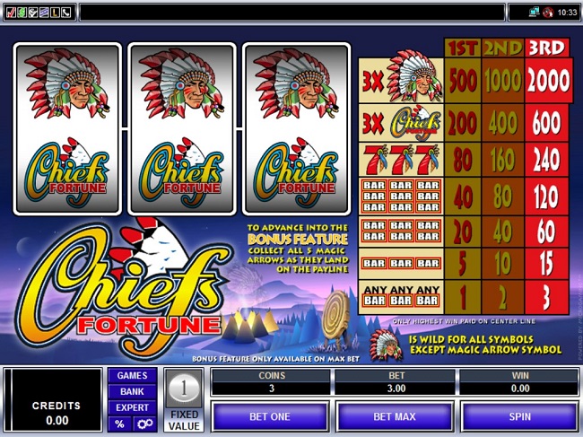 Chief’s Fortune Online Video Slot is a humorous slot with the excellent bonus game. Even despite one pay-line slot, it has highest pay-outs for its players. Great Native-music compliments to the slot. Though there are no free spins on the slot, Jackpot and bonuses will keep your bank ticking.