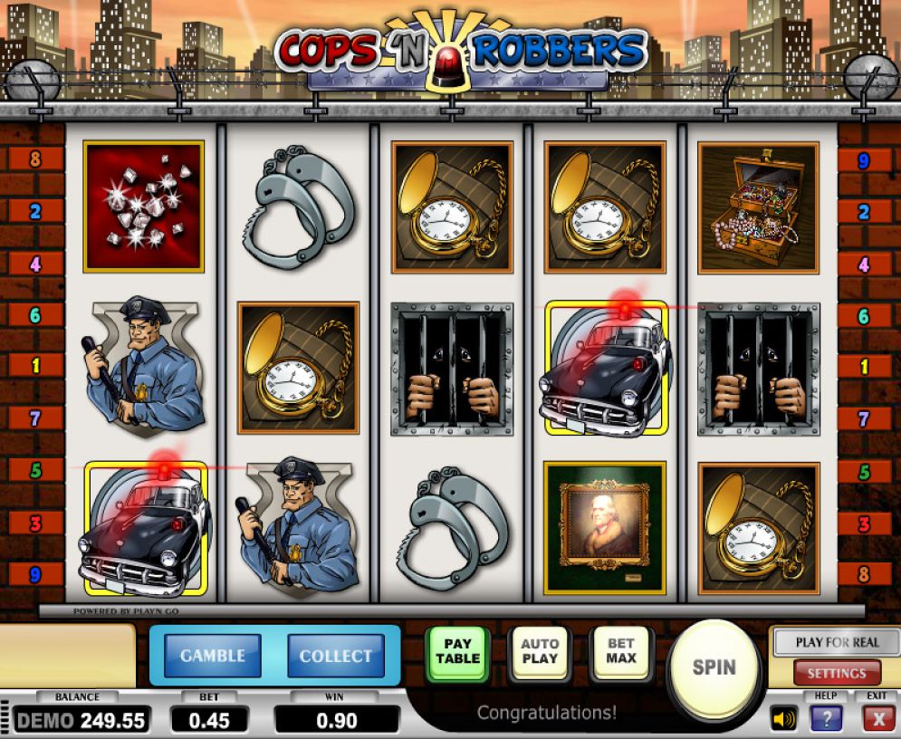 Cops ‘N’ Robbers Online Video Slot is a nice slot to play. The graphics quality though is a bit disappointing but looking on the feature available it still worth your money. Trigger the free spins feature in the car chase bonus feature and win big prizes that are doubled if you outsmart the cops.