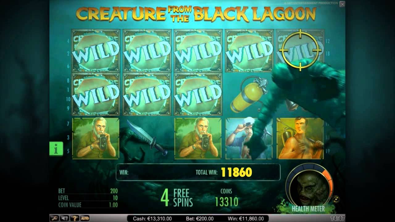 Creature From The Black Lagoon Online Video Slot is a 5 reel with 20 paylines video slot powered by Net Entertainment. The slot has a theme that features the 1954 horror film that had a creature that was half a fish and half human. The creature is creepy and hunts for human flesh. The setting is the same with the game’s background showing a black lagoon with the creature coming out of it to reach out to you. The 20 paylines monster video slot has re-spins, free spins, sticky wilds and spreading wilds. The slot is also available for play in all operating systems thus you can play from the comfort of your device.
