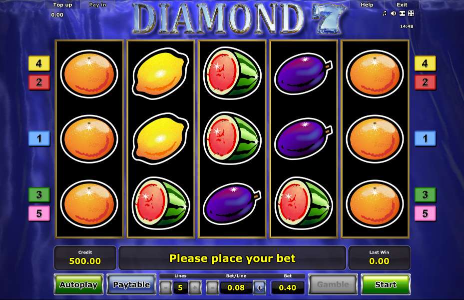 Diamond 7 Online Video Slot is a 5 reel with 5 paylines video slot powered by Novomatic. Once again Novomatic goes the old way with this amazing Diamond 7 slot with fruit and classic slots. The slot has some creative designed animation whereby the fruit symbols turn into jeweled symbols when they make a win. The higher your stakes, the higher the prize you win. The slot can also be played from all devices supported by Mac, Linux or Windows operating systems.
