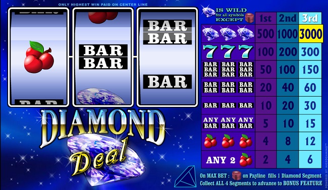 Diamond Deal Online Video Slot is a classic slot designed by Microgaming. It is a three-reel with one pay-line slot which has a diamond theme. Rare, and valuable diamonds are the best thing to gamble in the slot and win sparkling and high-value prizes for them. Despite a classic slot, there are unique features in the slot. The dark-blue and purple color background add special effect to the sparkling diamonds in the slot.