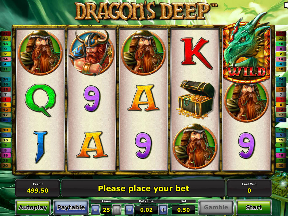 Dragon’s Deep Online Video Slot is a 5 reel with 25 paylines video slot powered by Novomatic. The slot features the dragon that guards huge treasures in this tale. There is a band of warriors who are on the move to find the treasures. When the dwarfs make a winning they perform some creative animations and the dragon as usual will spit fire on the screen. The players benefit from symbol payouts, free spins, wilds and scatters. The slot is also available online for play without any download required.
