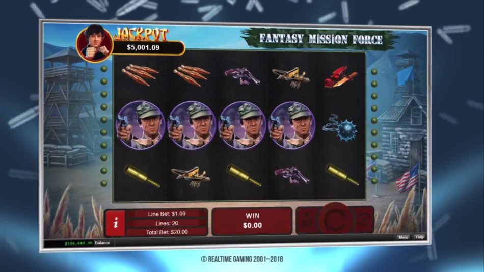 Fantasy Mission Force Online Video Slot is a 5 reel with 20 paylines video slot powered by Realtime Gaming (RTG). The slot is based on the 1983 film featuring Jackie Chan. In the movie he was not the star but in the slot he has the starring role. This is sure to excite Jackie Chan fans. The story takes place during the World War ΙΙ. The symbols are designed in a cartoon style and film soundtracks accompany the game play. The features include free spins, multiplier wilds, and instant prizes.
