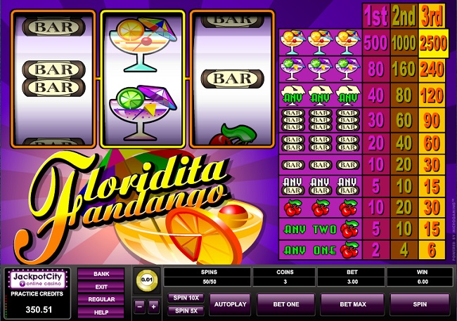 Floridita Fandango Online Video Slot is a classic slot with three-reels and one pay-line powered by Microgaming. The giant cocktail and the sunset colors which decorate the main screen suggest a tropical environment. The reels are in the top left-hand corner of the screen above the big orange drink. Refreshing tropical drinks will quench your thirst for rewards.