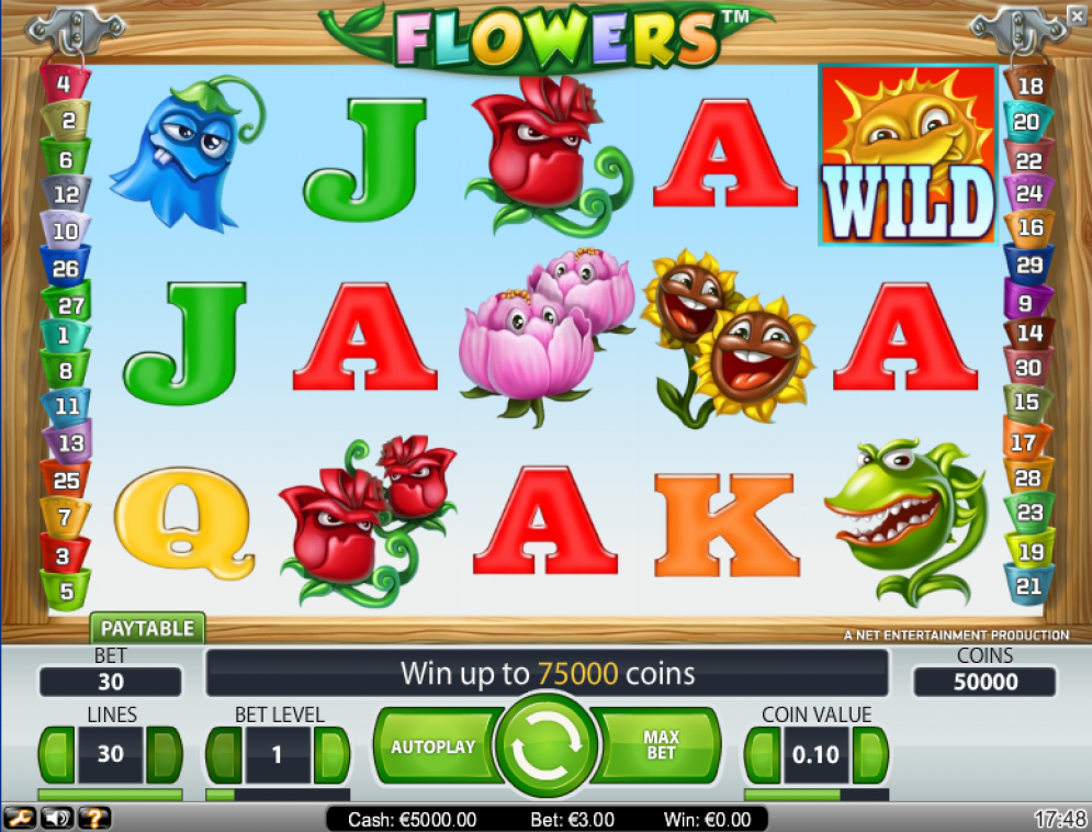 Flowers Online Video Slot is a 5 reel with 30 paylines video slot powered by Net Entertainment. Net Entertainment has once again designed a beautiful slot with an amazing theme featuring animated beautiful flowers. The doubles symbols make this slot an ideal one. You notice them just when launching the game. The game screen is also lit with the well-blended colors of the flowers. There are scatters, wilds symbols, free spins as well as multipliers. The slot is also compatible with MAC, Windows and Android Operating systems and is ready for play without downloading.