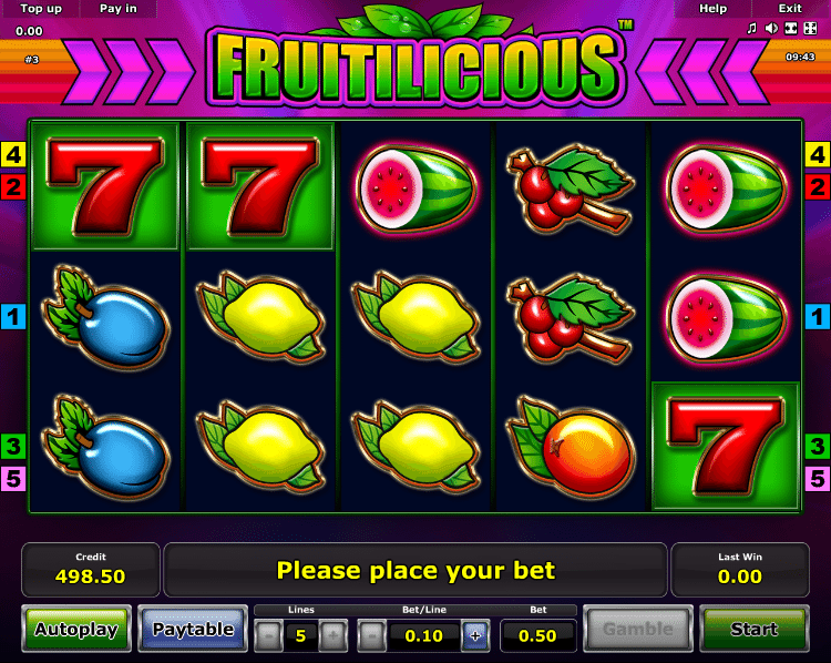 Fruitilicious Online Video Slot is a 5 reel with 5 paylines video slot powered by Novomatic. This is a classic symbols slot with retro symbols. The background is designed with a purple color with fruits that appear to be ripe. Fruit symbols appear randomly on the reels and it should be a reason why this slot should be on your most favorite games. The slot has the fantastic feature where you can win symbol payouts when you match symbols on both ways. There is no free spins rounds, scatters or wilds or any thematic bonus feature but you can make great cash with the symbol payouts. The slot can be played from all devices supported by Mac, Linux or Windows operating systems.