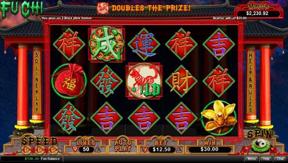Fu Chi Online Video Slot is a 5 reel with 50 paylines video slot powered by Realtime Gaming (RTG). The slot is based on the Chinese year of Dog which according to the Chinese Horoscope is 2018, the year the slot has was released. It is set within an Asian temple and they feature Asian themed symbols such as the oriental fruits, firecrackers and Chinese letters. The slot has progressive jackpots; major and minor to be won. Apart from the jackpots, there is the free spins feature and multiplier bonus. The slot can be played from devices supported by Mac, Linux or Windows operating systems.