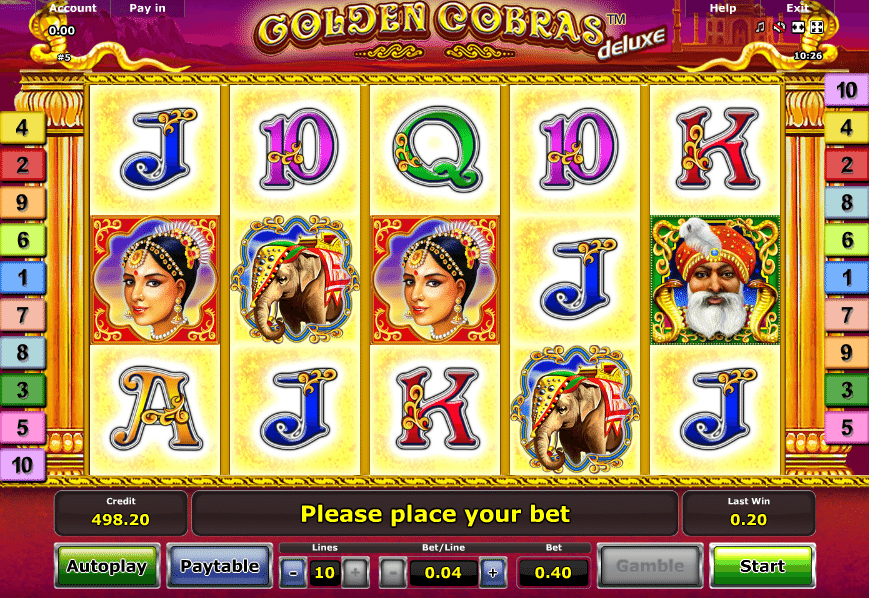 Golden Cobras Deluxe Online Video Slot is a 5 reel with 10 paylines video slot powered by Novomatic. The slot has an Indian theme with king cobra being the symbol to look out for. The slot highlights the Indian culture of taming cobras in round baskets. You will this as these baskets with cobras trigger the free spins with multiplier bonuses. On the reels you will see symbols such as Taj Mahal and an elephant dressed with traditional Indian clothes as well as snake charming guru.  The slot can be played from all devices supported by Mac, Linux or Windows operating systems.