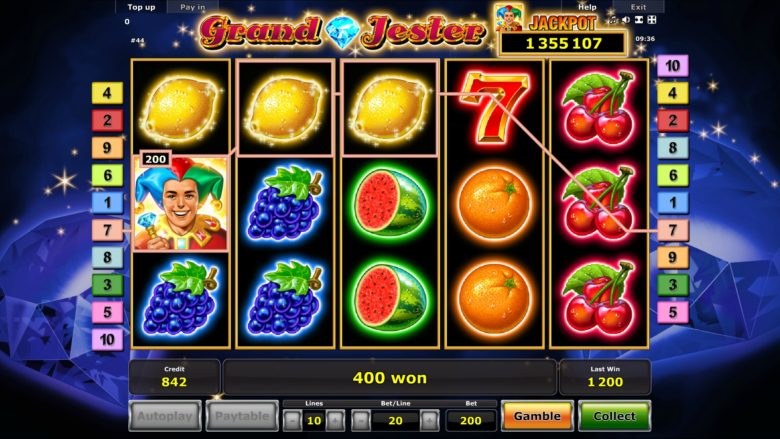 Grand Jester Online Video Slot is a 5 reel with 10 paylines video slot powered by Novomatic. The Grand Jester features your favorite fruit and classic symbols in this nicely designed retro slot to give you a wonderful game experience. The Jolly Jester themes have really attracted Novomatic and associates; there are many slots by Novomatic with the same theme. But that doesn’t stop us from playing this slot. The game play is typically a retro fruit symbol slot style and you just land symbols on the reels to win payouts. But there is some modern twist added to it with the introduction of the free spins and progressive jackpots features.