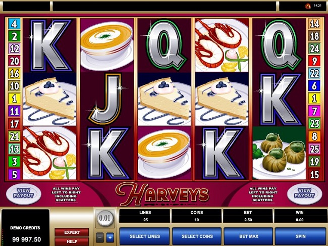 Harveys Online Video Slot is a five-reel with twenty-five pay-lines slot from Microgaming. It’s an online slot which tempts the player with a range of tasty-looking food and refreshing champagne. The game has the name of the restaurant. The design of the game is straightforward and entertaining. The reels occupy most of the screen with no particular background.