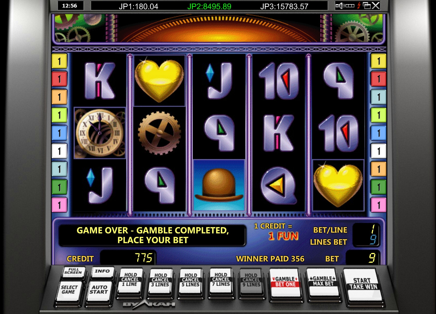 The symbols include poker symbols such as hearts, diamonds, clubs, mysterious cogs, bowler hats, clocks and gramophones.