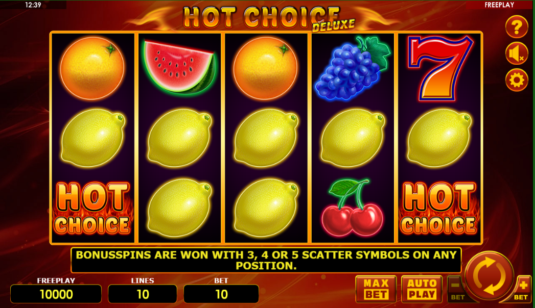 Hot Choice Deluxe Online Video Slot is a 5 reel with 10 paylines video slot powered by Amatic. The deluxe version has similarities with its predecessor. The design is retro and with classic fruit symbols. It is played on a 5×3 grid with up to active lines. To win a payout you will have to match at least 3 symbols on a payline from the leftmost reel. The game offers good payouts for the symbol combinations and a free spins feature with multiplier bonuses of up to 9x. It can also be played on mobile devices.