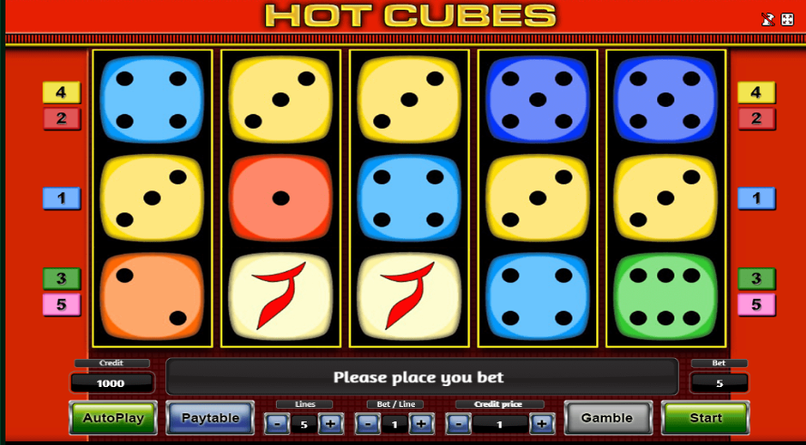 Hot Cubes Online Video Slot is a 3 reel and 5 paylines video slot powered by Novomatic. On the reels you will find colored cubic die. The dies are displaying the 6 faces with each dice face having a different symbol payout. You can win prizes by just forming combinations of 3 symbols on the reels. The slot has a classic look and 2D graphics but still it looks great and has big wins through the symbols payouts. The slot can be played from devices supported by Mac, Linux or Windows operating systems.