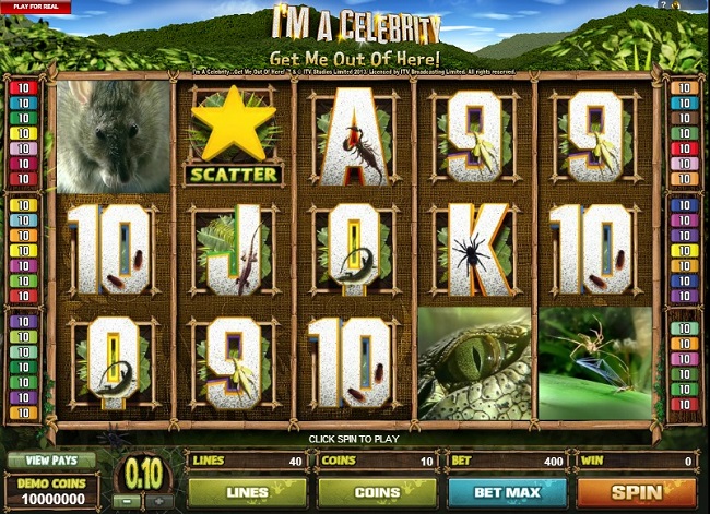 I’M A Celebrity Get Me Out of Here Online Video Slot is a five-reel with forty pay-lines slot game from Microgaming. The slot has a theme of a popular television show in the UK. It involves dumping some down and out ‘celebrities’ in the Australian jungle and persuading them to eat kangaroo testicles. The reels spin in a bamboo frame in front of the view of a blue sky and forested hills. The game complements the television show regarding graphics, animations, and sound effects.