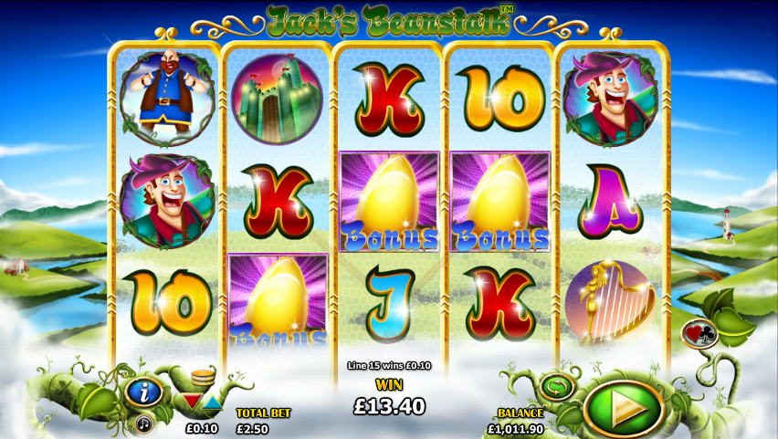 The symbols include a harp, hammer, giant’s castle, the giant, Jack himself, magic beans, goose, golden egg and high value card numbers such as A, J, K, Q, 10 and 9. The wild symbol is represented by the magic beans.