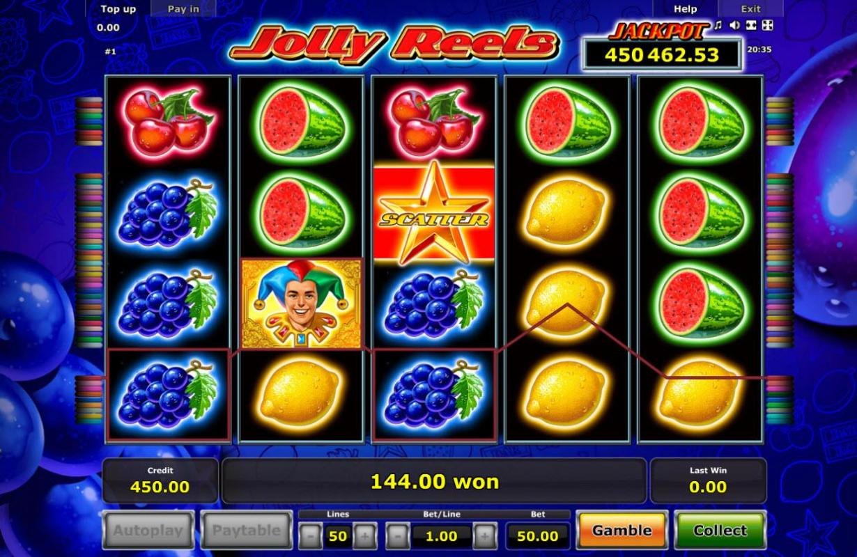 Jolly Reels Online Video Slot is a 5 reel with 50 paylines video slot powered by Novomatic. Jolly Reels is nothing far from the fruit symbol slot. The entire reels are filled with colorful fruit symbols and other symbols such as the funny Jester, golden stars and lucky 7s. Contrary to other fruit based slots, Jolly Reels has bonus features such as the progressive jackpot and the free spins which is not common in fruit slots. Landing symbols on the reels will win you payout prizes as well as triggering the slot features.