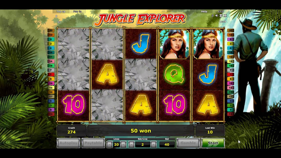 Jungle Explorer Online Video Slot is a 5 reel with 20 paylines video slot powered by Novomatic. The jungle explorer takes you to the thick rainforest and the main character depicting an Indiana Jones explorer. The slot is about hunting for hidden treasurers in the forest. The slot has a distinctive and cool feature, which is the tumbling reels feature. The tumbling reel feature allows you get new symbols on winning reels allowing you make symbol combos faster than in the normal game. There are scatters, wilds, multipliers and free spins feature.