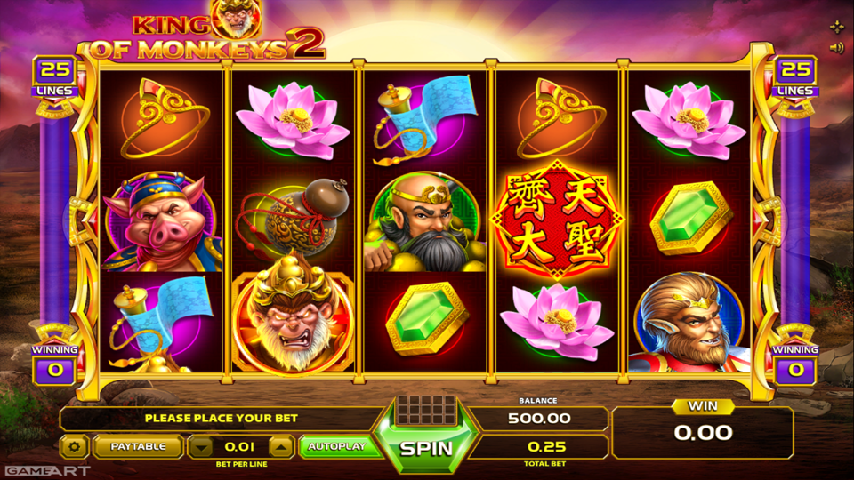 King of Monkeys 2 Online Video Slot is a 5 reel with 25 paylines video slot designed and powered by Game Art and Rival Gaming. The slot is a sequel production of the King of Monkeys slot themed around Sun Wukong and his allies; Tang Sanzang, Zhu Wuneng and Sha Wujing in their search for glory and riches. The slot has improved graphics and visuals with nice features and increased winning potential.