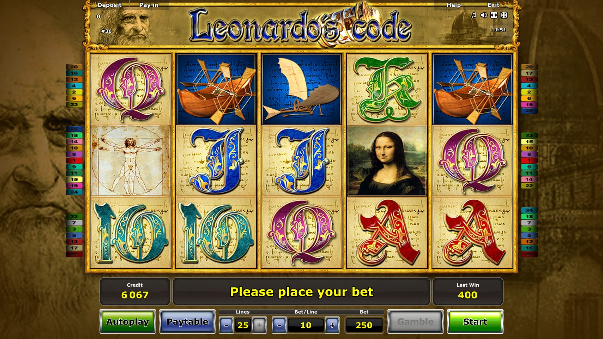 Leonardo’s Code Online Video Slot is a 5 reel with 25 paylines video slot powered by Novomatic. The slot features the most famous painter Leonardo Da Vinci. The man who painted the portrait of Mona Lisa and so many other famous characters is here on the reels. The slot is set in an old world setting with historic paintings and portraits on ancient scrolls taking over the screen. The slot has 3 rows and 5 reels with a variety of symbols to land on the reels and win payouts.  Features available include free spins, wilds and scatters. The slot can be played from devices supported by Mac, Linux or Windows operating systems.
