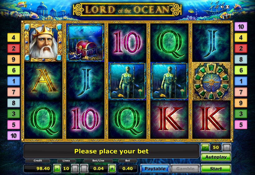 Lord of the Ocean Online Video Slot is a 5 reel with 10 paylines video slot powered by Novomatic. The slot is based on the ancient Greek mythology featuring Poseidon the lord of the ocean. There are treasures found within the ocean guarded by the lord of the ocean and you can find some to win payouts.  There are wilds, scatters and free spins feature. The reels are set in cool blue background theme which provides a refreshing and quite game play environment with just soft music on the background. The slot can be played from all devices supported by Mac, Linux or Windows operating systems.