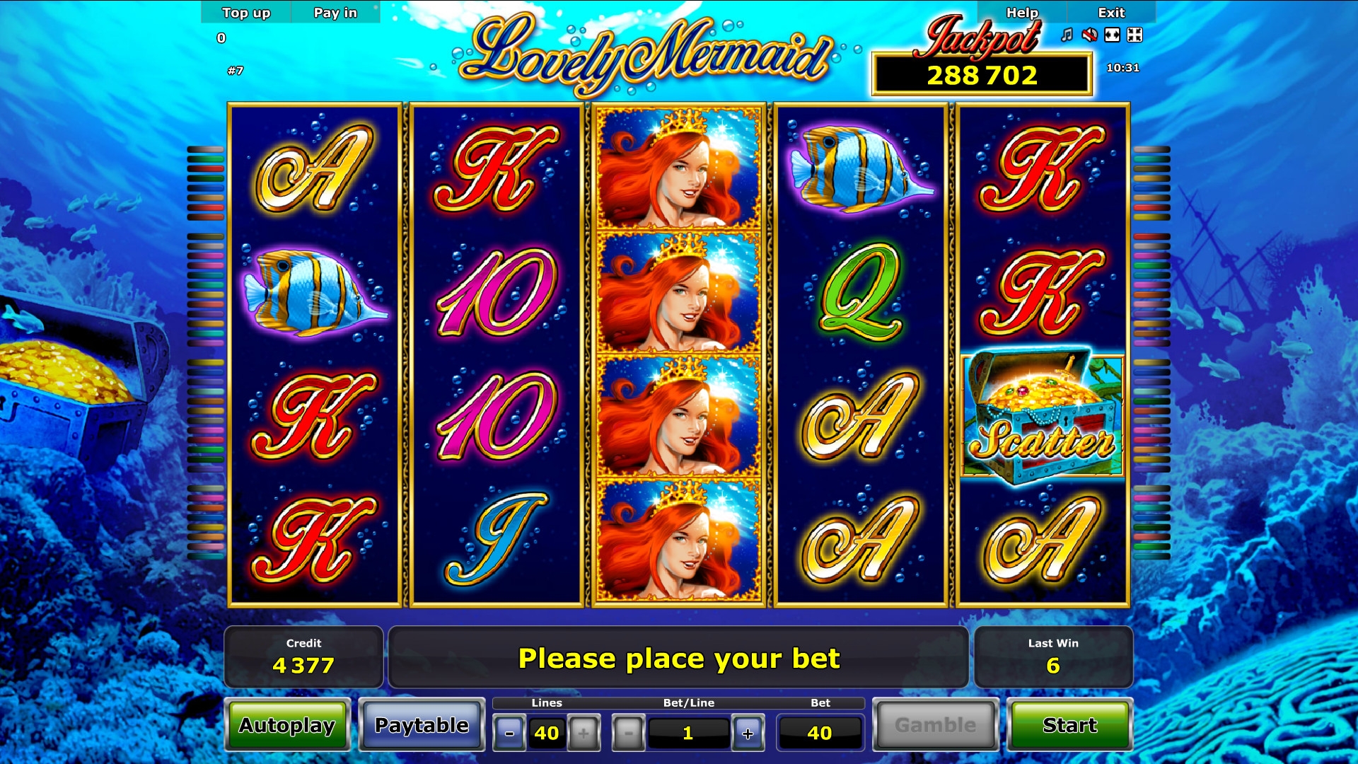 The symbols include game cards such as A, J, K, Q, 10 and 9, tropical fish, seahorses, puffer fish, lobsters, sea turtles, mermaid with flowing red hair and a treasure chest.