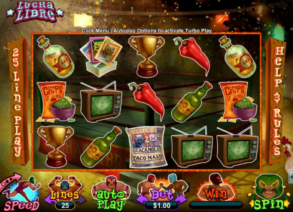 Lucha Libre Online Video Slot is a 5 reel with 25 paylines video slot powered by Real Time Gaming (RTG). The slot is about the Mexican Wrestling theme film Nacho Libre. The game has been designed to depict a typical Mexican culture with prizes won for enjoying all sorts of pre-fight Mexican cuisines such as the chilies, beer and nachos. Features available include Time to Rumble feature, wrestling scatters and mask of fiery doom feature. The slot can be played from devices supported by Mac, Linux and also Windows operating systems.