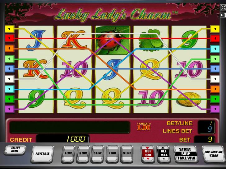 Lucky Lady’s Charm Online Video Slot is a 5 reel with 9 paylines video slot powered by Novomatic. The slot is based on Fortune telling adventures with some mystery characters and magical features. The slot is designed with cool graphics and animations that enhance its classic style of game play. On the reels you will find symbols such as the ladybirds, horseshoes and leaf clovers too. The slot is played on 3 rows and 5 reels giving it a 5×3 grid where you land these symbols to win payouts. Combinations if 5 identical symbols pay the most. There are wilds, scatters, free spins and play buttons such as the auto play that spins 50 spins automatically and the gamble game button.