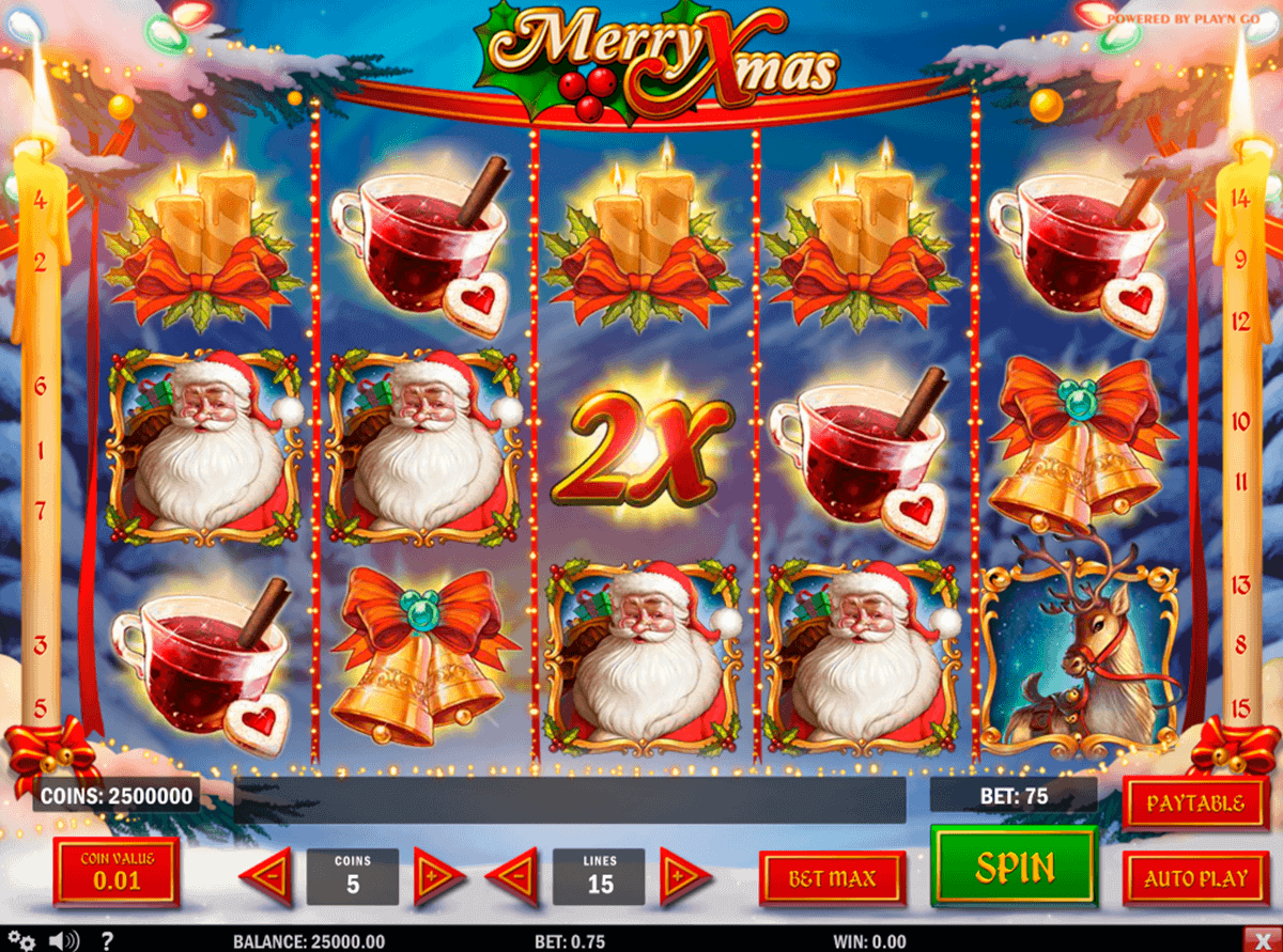 The betting range is from 0.15 to 18.75 coins per spin. The symbols include Santa, sweets, mulled wine, bells, deer and candles.