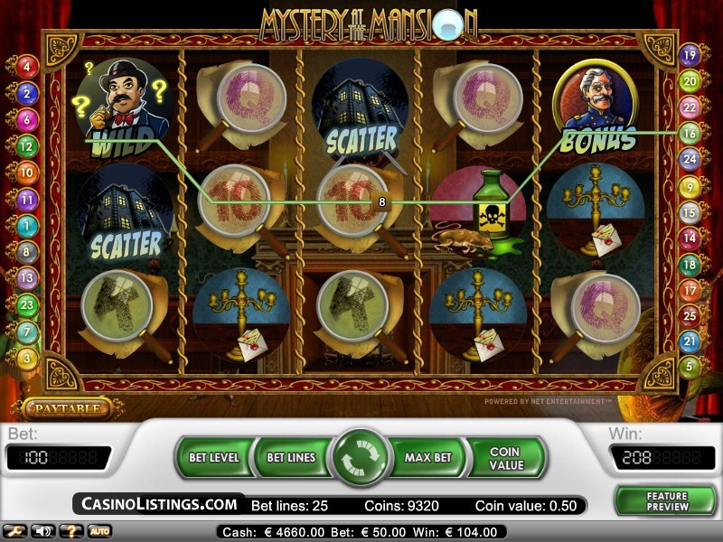 Mystery At The Mansion Online Video Slot is a 5 reel with 25 paylines video slot powered by Net Entertainment. The slot brings you at the center of a murder case within a mansion. The setting is in a mansion with a murder mystery going on. There are clues everywhere to find the culprit but you can’t trust anyone in the mansion. The slot has high visual graphics and animations that alights every game step. The slot generally looks great. There are wild symbols, free spins, scatters and bonuses. The slot is also compatible with Mac, Linux and Windows operating systems.