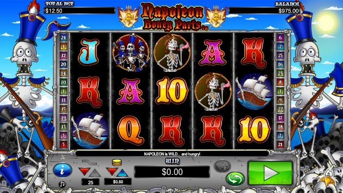 Napoleon Boney Parts Online Video Slot is a 5 reel with 25 paylines video slot powered by NextGen Gaming software. The slot has a theme that features the famous king Napoleon Bonaparte and his mission to concur the world. Here is not in normal flesh but in skeletons and he is back to finish his mission. He only needs your help to achieve his mission. On the background is the skeleton of the famous king with his hut and guard of honor in an animated environment with skulls believed to be belonging to the slaves he captured and maybe those he killed. The setting is on an open ground with blue sky. Napoleon will reward you with scatters, free spins, wilds and also nice bonuses if you help him achieve his mission.