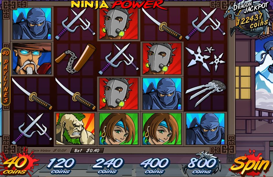 Ninja Power Online Video Slot is a 5 reel with 40 paylines video slot powered by Winaday. The slot is based on a Samurai theme with Japanese Ninja warriors representing their most valued way of life. On the reels you will find some of the iconic symbols and characters such as dragon wild, shuriken, katana Samurai swords and nunchacku. The dragon is the wild symbols and can also appear as sticky to give you extra wins. There are also scatters, free spins and other bonuses. The slot can be played from devices supported by Mac, Linux or Windows operating systems.
