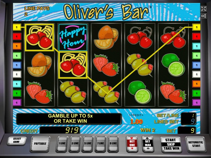 The coin value ranges from 1 coin to 100 coins per line. The minimum stake per spin is just 1coin while the maximum stake is 900 coins if you activate all the lines. The symbols include cherries, oranges, lemons, olives, lime, star fruits, palm tree and flamingo shaped cocktail stirrers, couples, friends at the bar and Oliver.