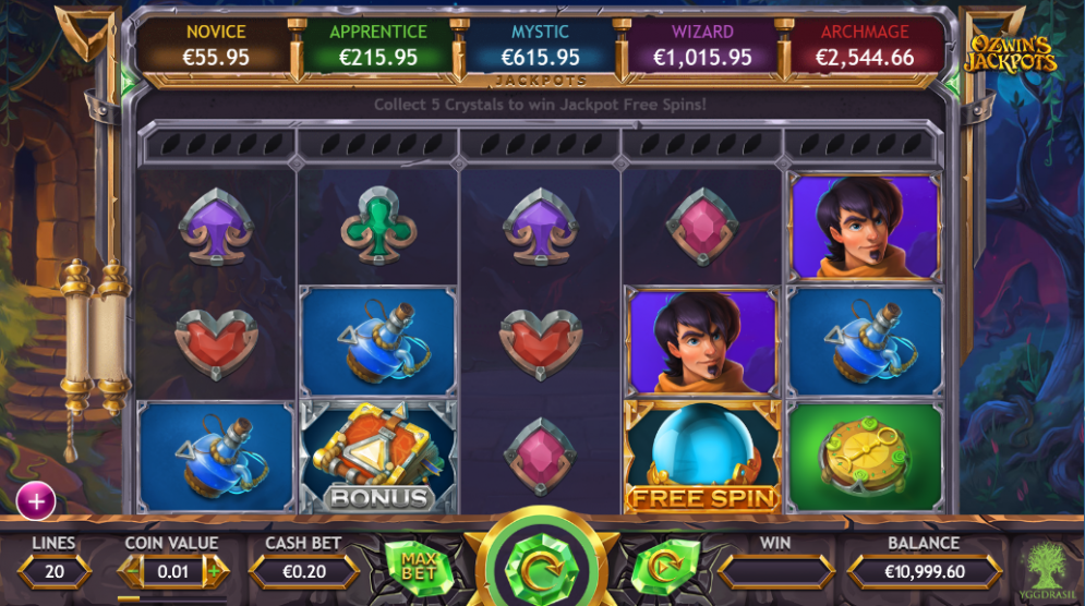 Ozwin’s Jackpots Online Video Slot is a 5 reel with 20 paylines video slot powered by Yggdrasil. The slot has a sorcery theme with a magical and mysterious feel. On the reels you will find magical stuff such as the spell books and bottles of potions. The slot comes with a nice graphics design and animations that make it enjoyable to play. It has features that will give you great wins such as the free spins, progressive jackpot and spell book bonuses. There is also a classic vibe brought out by the card suits included in the game as low paying symbols. The slot can be play from devices supported by Mac, Linux or Windows operating systems.
